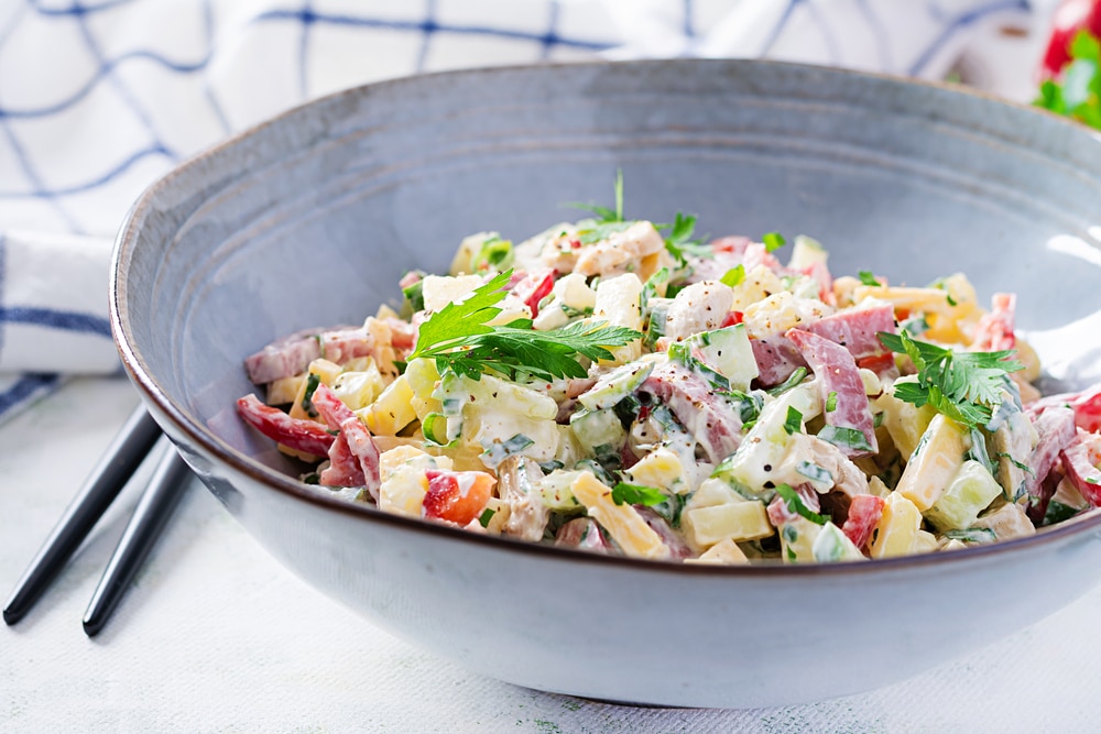 This is not your usual potato salad. Adding veg and meat creates a whole new recipe and will go down a treat. This fresh salad will become a hit and is extremely easy to make. Plus, it will look like you spent hours slaving away, when really, it’ll take you less than 30 minutes.
